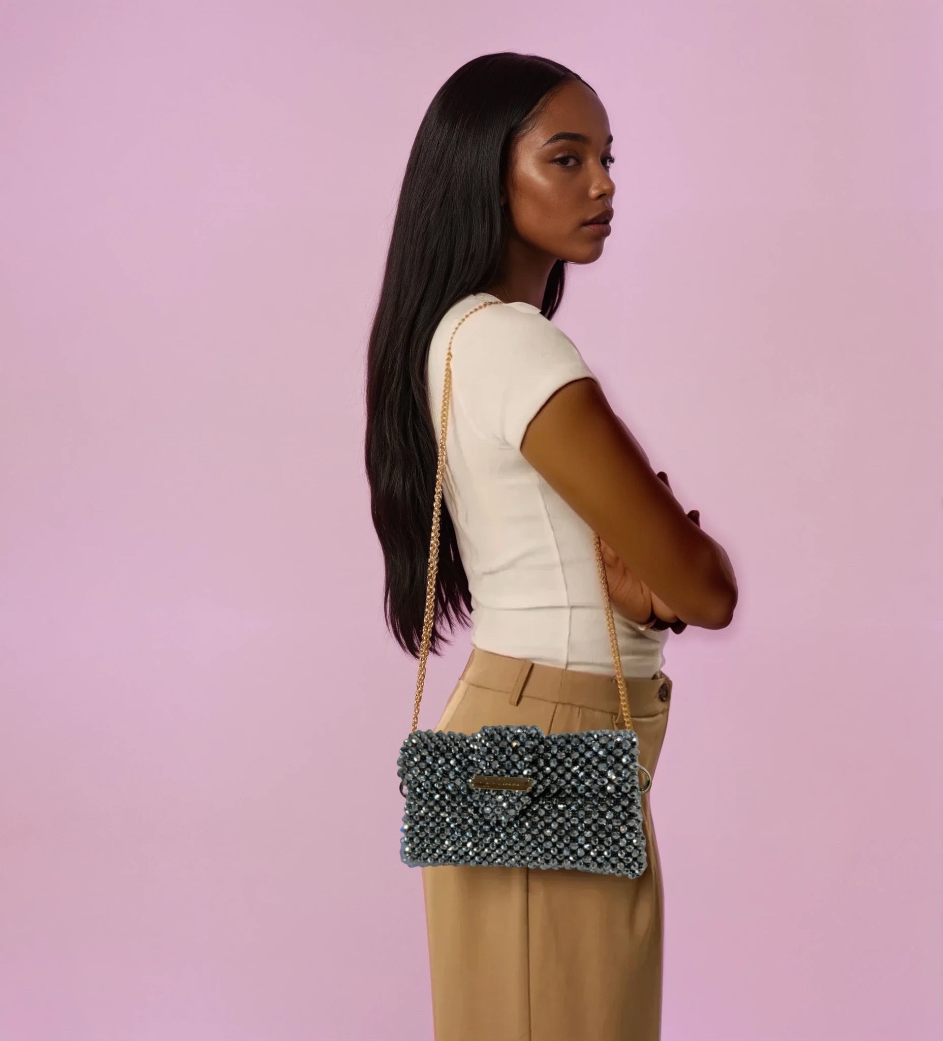 Stylish, elegant and high quality, that's how you can describe the Cali. The collection is made of top quality Czech glass beads. The applications are gold, which gives the bags a luxurious look.
